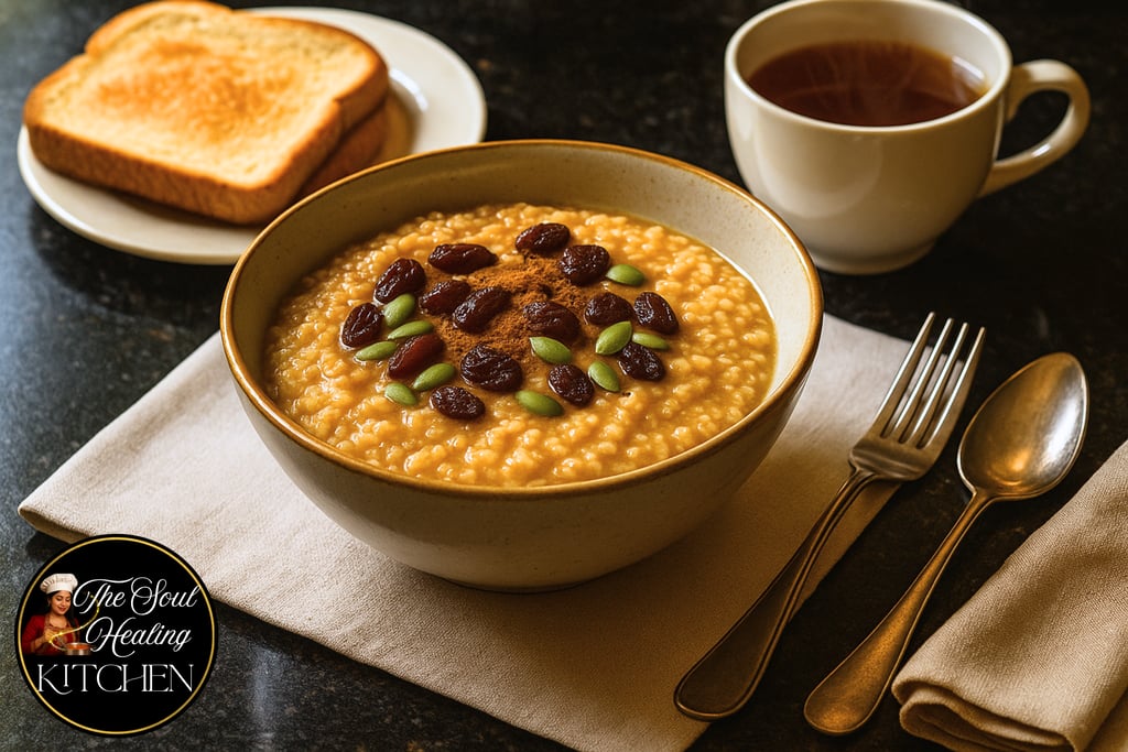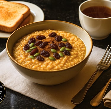 This nourishing porridge is designed to ignite Jatharagni (digestive fire), stabilize blood sugar, melt sluggish Kapha, and energize the body for the day ahead. Fresh ginger stimulates circulation and awakens digestion, while cinnamon improves insulin sensitivity, balances blood sugar, and supports healthy weight metabolism. This porridge is ideal during cold seasons, Kapha imbalance, slow digestion, hypothyroidism tendencies, or when you need a clean, energizing Ayurvedic breakfast.