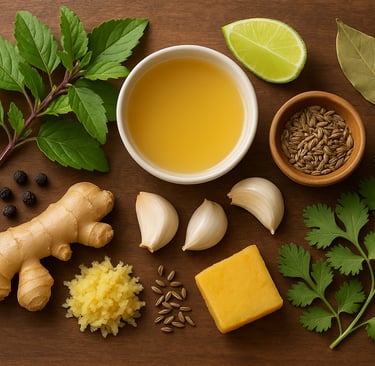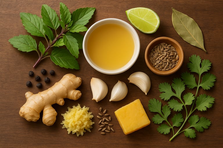 Tulsi, black pepper, ginger, and garlic melt Kapha stagnation, clear mucus, and stimulate sluggish Agni.