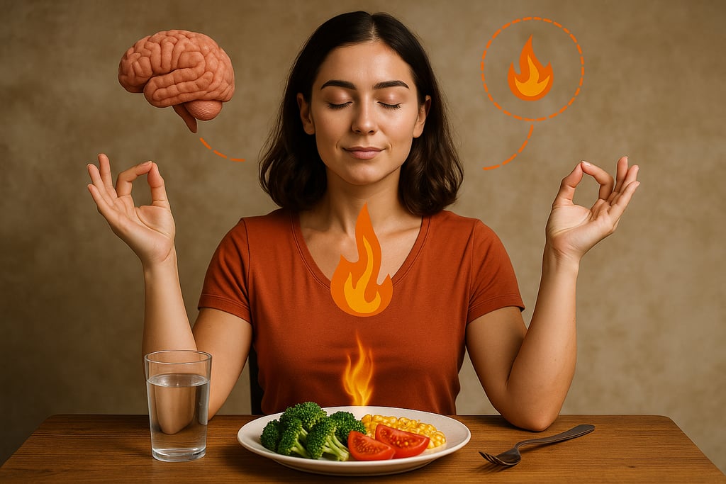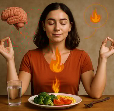 This article explores the powerful connection between your emotional state and your digestive fire, showing how mindfulness during meals can dramatically improve Agni, absorption, and overall well-being. Blending classical Ayurvedic wisdom with modern research on the gut–brain axis, it explains how stress, distraction, and emotional turbulence weaken digestion, while calm, intentional eating strengthens it. With practical guidance and a light-hearted tone, this piece reveals how simple mindful practices can transform every meal into a nourishing, grounding ritual for both body and mind.