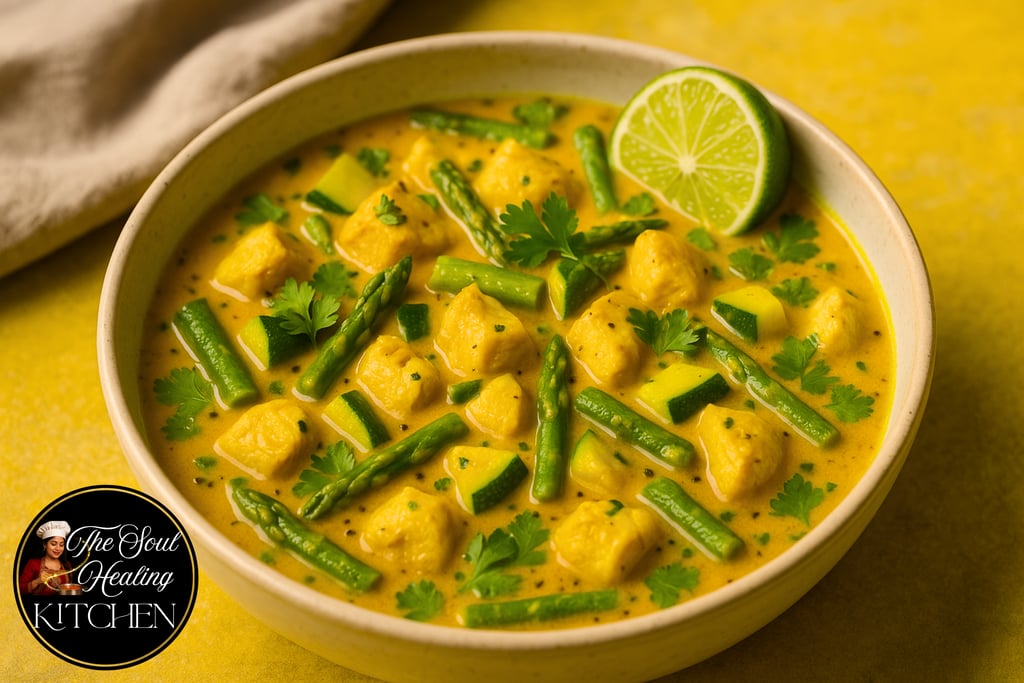 This gentle spring curry is designed to cool excess Pitta, support liver cleansing, calm inflammation, nourish muscle tissue lightly, and enhance digestion without heat. Asparagus, zucchini, and coconut milk bring cooling, sattvic qualities, while the spices are carefully selected to soothe Pitta while still activating Agni gently.
